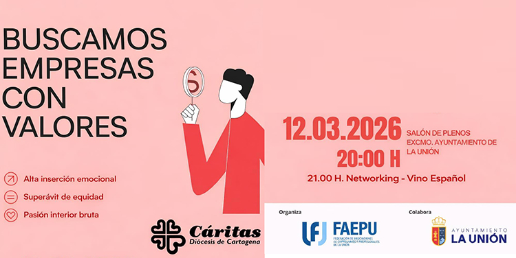 La Federación de Asociaciones de Empresarios y Profesionales de La Unión, en colaboración con Cáritas Diócesis de Cartagena y el Ayuntamiento de La Unión, va a celebrar el jueves por la noche un encuentro dirigido a todo el tejido económico y empresarial del municipio, de la comarca y del territorio autonómico. Tendrá lugar en el salón de la Casa del Piñón, entrada libre y gratuita.