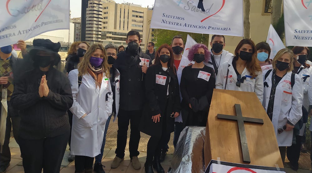La convocatoria es llevada a cabo por la plataforma 'Salvemos nuestra atención primaria', de la que forman parte asociaciones de vecinos, sindicatos y profesionales sanitarios, entre otros. Anuncian que seguirán las movilizaciones hasta conseguir que el 15% del presupuesto de de la sanidad regional se destine a la atención primaria.