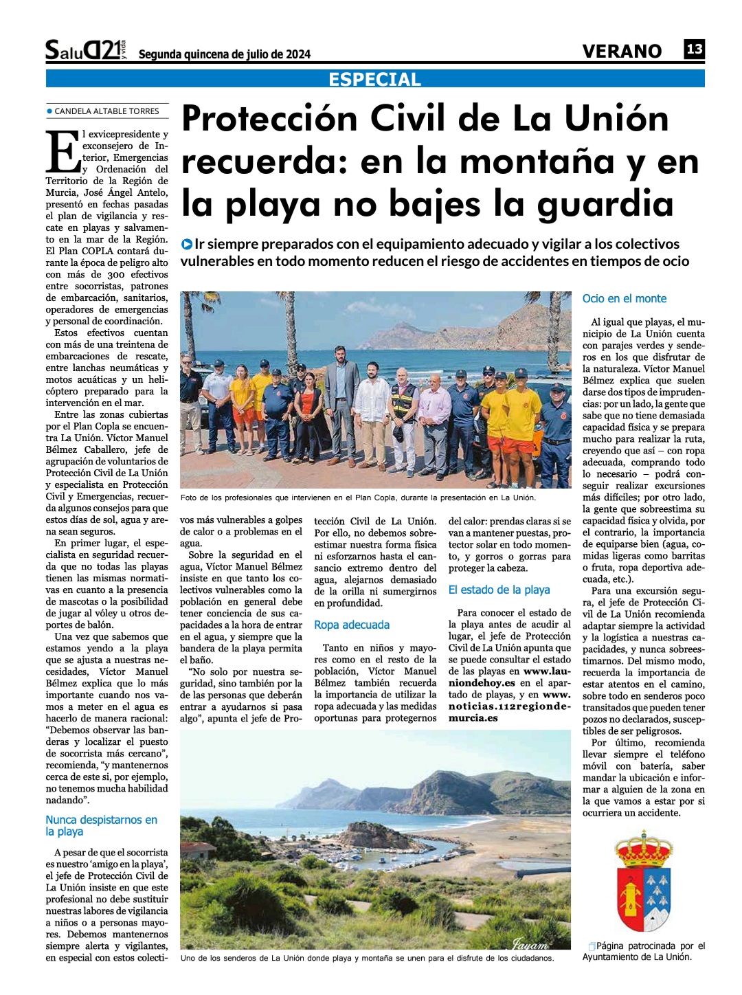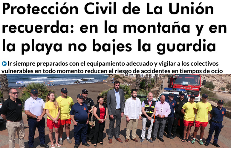 El periódico de papel que se distribuye de forma gratuita por todos los centro sanitarios de la Región de Murcia, a través de la periodista Candela Altable, ofrece un reportaje al cuerpo de servicio público unionense, que ofrece interesantes y prácticos consejos de seguridad para la actividad de ocio en la playa y en la montaña.