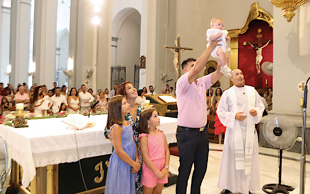 Antonio Torres Meroño, el nuevo miembro de la saga Jayam, ha sido bautizado con agua del río Jordán por el reverendo Gines Luis Vicente, párroco del templo de Nuestra Señora del Rosario de La Unión, siendo sus padrinos María Elena Meroño Rubio y Arón Torres Cervantes, quienes estuvieron acompañados de sus familiares.
