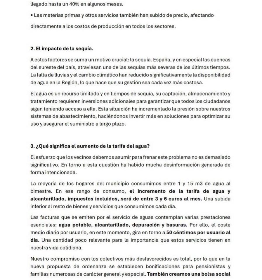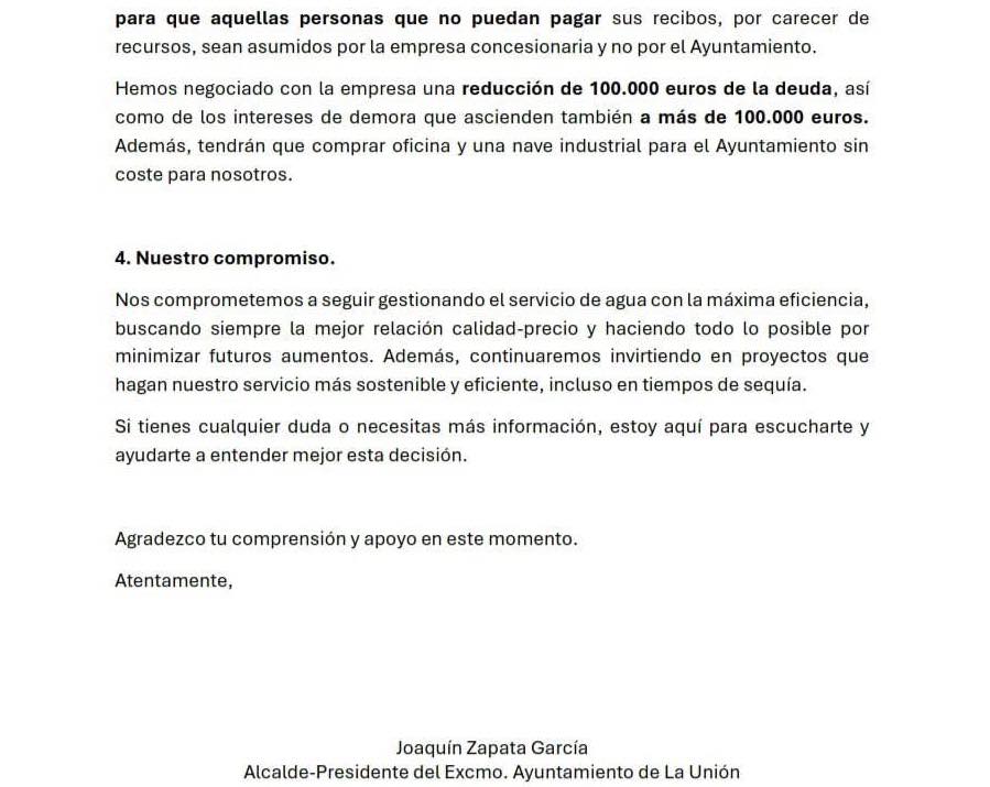 El primer edil de La Unión, Joaquín Zapata, difunde un escrito dirigido a los vecinos del municipio en el que expone los argumentos que llevan a su formación a actualizar la tarifa: "La estabilidad del servicio municipal de aguas estará en peligro y la deuda generada será imposible de asumir", afirma, indicando que el aumento por "el incremento de la tarifa del agua y alcantarilla, impuestos incluidos, será de entre 3 y 6 euros al mes".