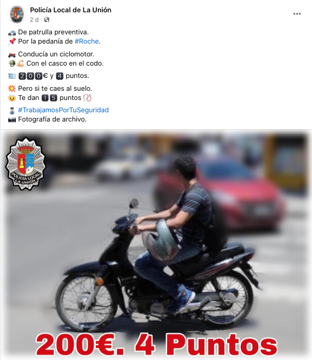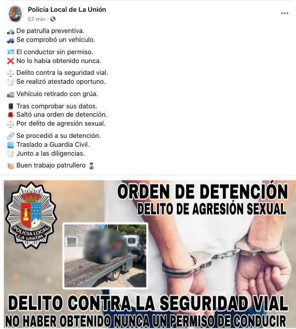 Una patrulla de la Policía Local de La Unión detectó a un conductor que llevaba un vehículo sin haber obtenido nunca el permiso de conducir y que había cometido un delito contra la seguridad vial. Además, resulta que esta persona se había saltado una orden de detención por agresión sexual, por lo que fue trasladado a la Guardia Civil. Otras actuaciones recientes del cuerpo municipal han sido sanciones de 200 euros por conducir mientras se utilizaba el móvil y por ir en moto con el casco en el brazo.