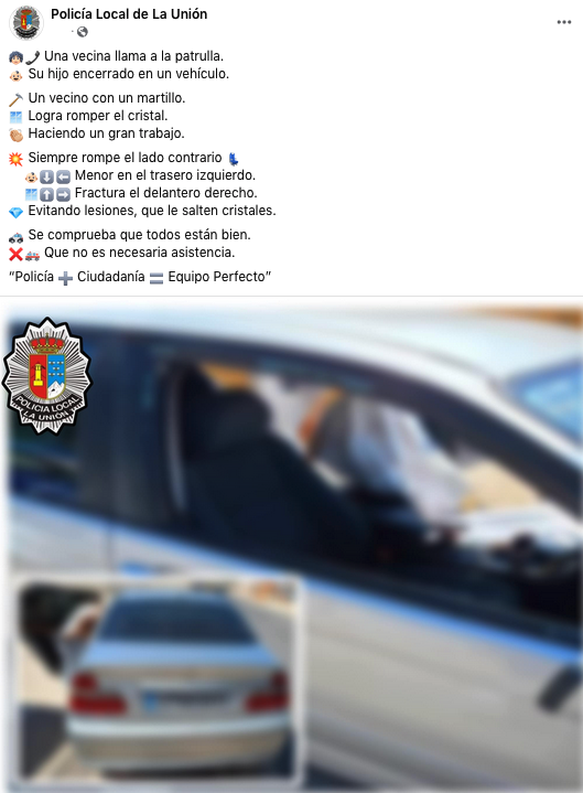 Se trataba del hijo de la conductora, la cual, al ver que no podía abrir el vehículo, avisó a la Policía Local de La Unión, aunque, antes de que llegara la patrulla, un vecino con un martillo rompió el cristal para sacar al menor.