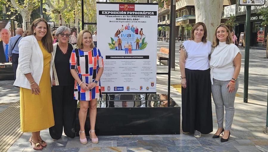 La directora del Centro de Personas Mayores de La Unión, Conchi Pagán, y la edil de Personal, Servicios Sociales y Personas Mayores del Ayuntamiento de La Unión, Dami García, han asistido hoy a la inauguración de la exposición fotográfica 'Ganadores de los premios Mayor del año', que ha tenido lugar en el paseo de Alfonso X de Murcia, presidido por la consejera de Política Social, Familias e Igualdad, Conchita Ruiz.