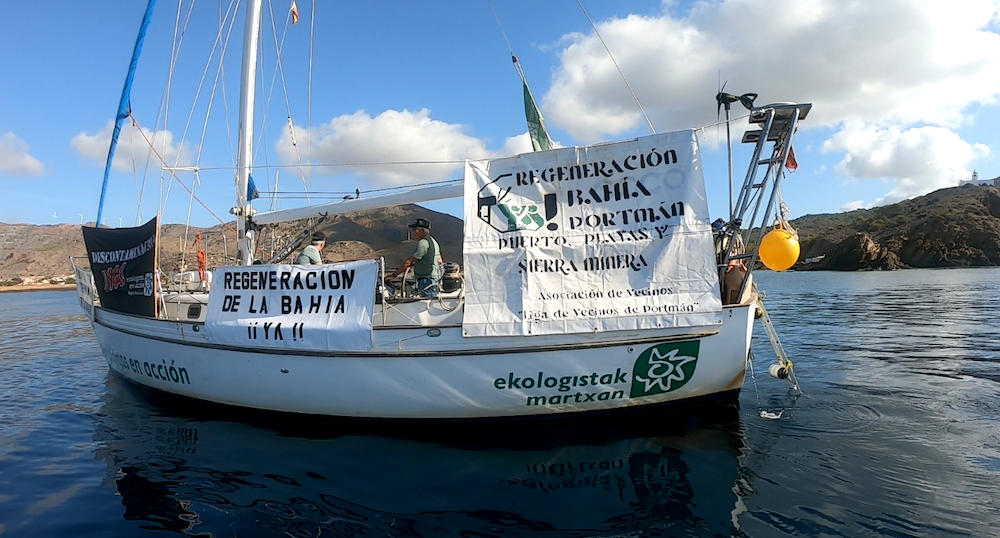 El velero 'Diosa Maat' de Ecologistas en Acción y la Liga de vecinos de Portmán han desplegado pancartas frente a la costa de Portmán para exigir su recuperación en base al acuerdo de 2011, descartando el sellado y el macropuerto de contenedores. Además, reiteran la necesidad de actuar en el resto de la Sierra Minera para eliminar los numerosos focos de contaminación minera que afectan a la salud de la población y del medio ambiente.
