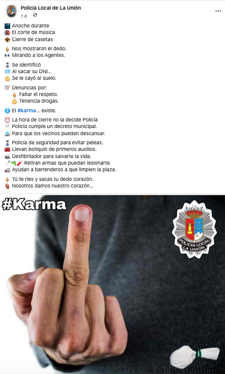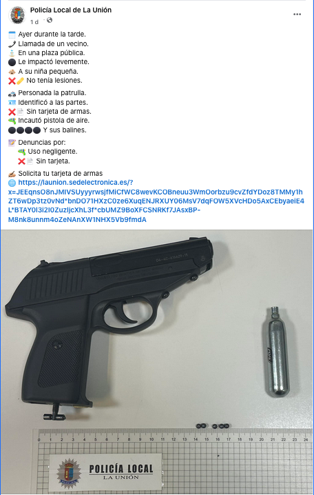 La Policía Local de La Unión informa que, al comunicar el corte de música y cierre de las casetas del recinto festero, una persona 'les levantó un dedo' a los agentes, quienes le pidieron que se identificara. Al hacerlo, se le cayó una bolsita con droga. Resultado: doble denuncia. Además, el cuerpo municipal informa de la multa por uso negligente de una pistola de aire tras denunciar un vecino que un balín impactó levemente a su hija en una plaza. Un tercer suceso es la gratitud a quien encontró un monedero con dinero y lo llevó al cuartel del 092.