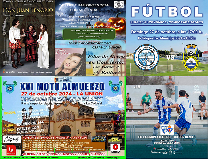 La actividad comienza hoy con un taller de 'Halloween' en El Garbanzal , baile con Pilar de Nerea en el centro de mayores y la obra 'Don Juan Tenorio' en el Museo Minero, mientras que el sábado se vivirá el clásico Real Madrid-Barcelona por televisión en las peñas de aficionados unionenses. El domingo será para el motoalmuerzo del MC La Unión en el polígono industrial. Además, sigue la exposición 'Gentes' en Roche. La propuesta deportiva ofrece partidos del CB Sierramar, Surmenor y del CD Vedruna, además de que los equipos de fútbol de La Unión Atlético y Ciudad de La Unión juegan el domingo en el polideportivo.