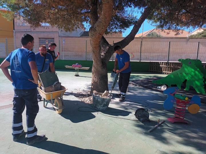 Otra intervención ha consistido en pintar el vestíbulo y el distribuidor de la planta superior, además de un aula. En el pabellón de infantil se ha actuado con tirolesa, hormigonando alcorques rotos y colocando bordillos en los alcorques para seguridad de los niños en el parque infantil.