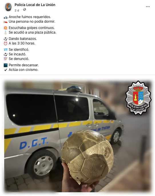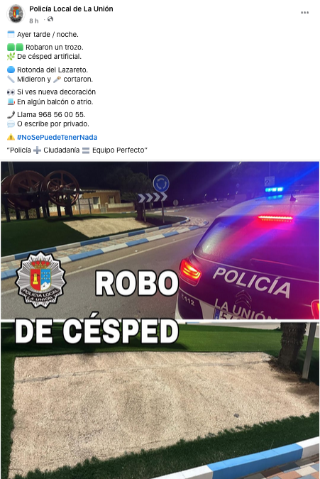 La Policía Local de La Unión informa de la sustracción de un trozo de césped artificial de la rotonda del Lazareto y pide a la población ayuda para localizar al autor. Por otro lado, agentes del cuerpo denunciaron a un hombre que a las tres y media de la madrugada no dejaba dormir a vecinos dando balonazos en una plaza pública.