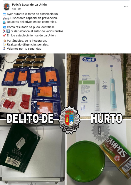 Agentes de la Policía Local dieron alcance al autor de varios hurtos en establecimientos de La Union, quien llevaba encima los objetos sustraídos. Por otro lado, el cuerpo municipal efectuaron durante una tarde-noche del pasado fin de semana un total de 24 denuncias, por conceptos que iban desde tenencia de drogas y armas hasta conducción negligente, no respetar señales de tráfico o ir dos personas sobre un patinete, entre otros.