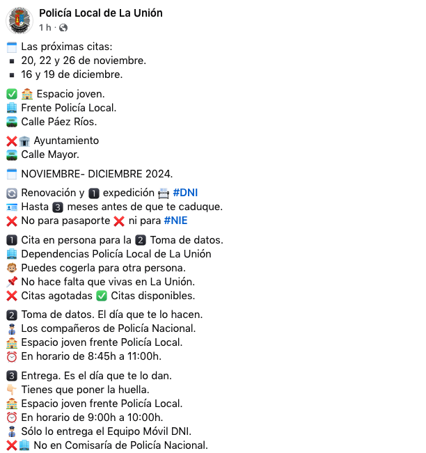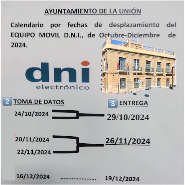 La Policía Local de La Unión informa que las próximas fechas de la presencia del equipo móvil de Policía Nacional para expedición y renovación del documento nacional de identidad son los días 20, 22 y 26 de este mes y 16 y 29 de diciembre.