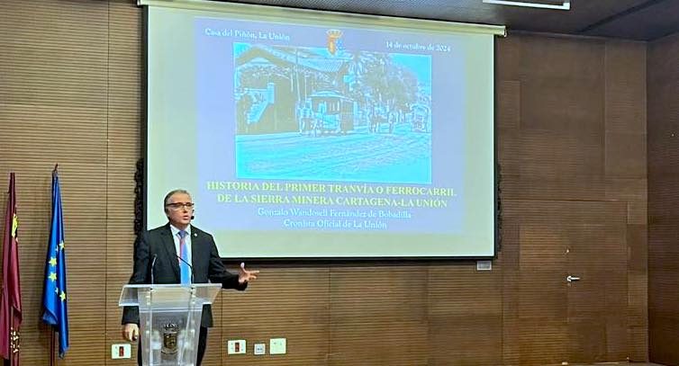 En la foto se observa a Gonzalo Wandosell durante la conferencia que ofreció en octubre sobre el '150 aniversario de la llegada del tranvía a la villa de La Unión 1874-2024'.