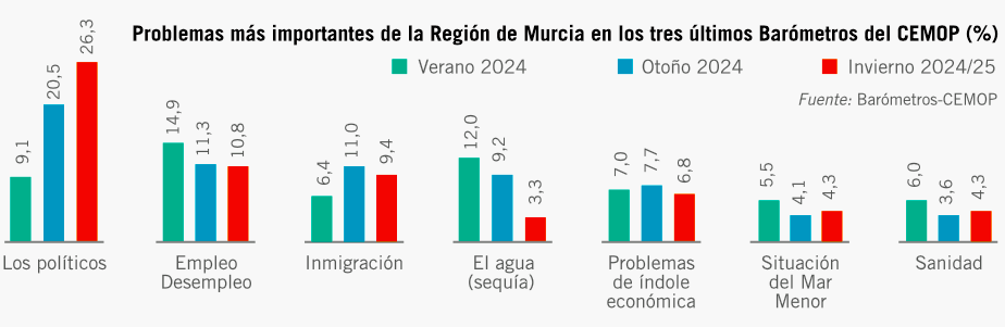 El desempleo y la inmigración ocupan las siguientes posiciones en el barómetro de invierno elaborado por el CEMOP, mientras que el Mar Menor y el agua pierden fuerza. Respecto a la intención de voto, si hoy se celebrasen elecciones autonómicas, PP obtendría 23 escaños, PSOE tendría 11; VOX sumaría 10 y para Unidas Podemos sería el restante.