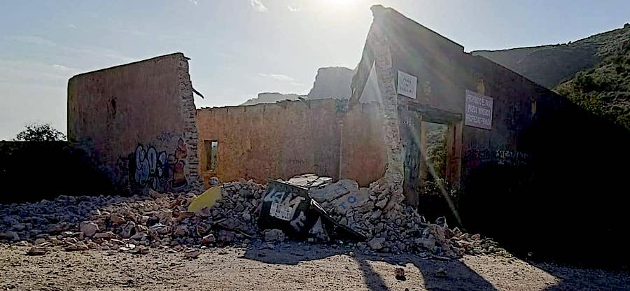 El fuerte viento que acompañó la jornada de ayer a nuestro municipio generó la caída del muro de un inmueble en ruinas en la Cola del Caballo (Portmán), informa la Policía Local de La Unión.