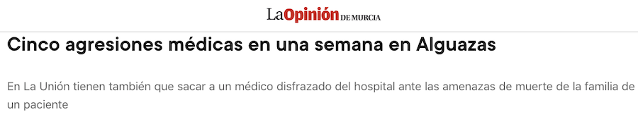 La Opinión publicó ayer una información de la que este diario del municipio de La Unión se hizo eco al considerar que tenía relevancia social, pues, además, también escuchábamos a una representante del Sindicato Médico comentarle ese supuesto incidente en La Unión en Onda Regional en unas declaraciones efectuadas con motivo de incidentes entre pacientes y facultativos en Alguazas (pinchar aquí). Lo hicimos, como otras veces, haciendo una alusión a la noticia y poniendo el enlace con la publicación, pues siempre respetamos a los medios y periodistas en su labor. Partimos de la base que es una información de otro medio y como tal lo dejamos indicado desde el primer momento, por lo que no es una cuestión de contrastar o no por nuestra parte, pues se presupone que un medio contrasta antes de publicar. Hacer alusión al origen de una noticia es algo habitual a diario en decenas de medios escritos, digitales, radiofónicos, televisivos, etc.