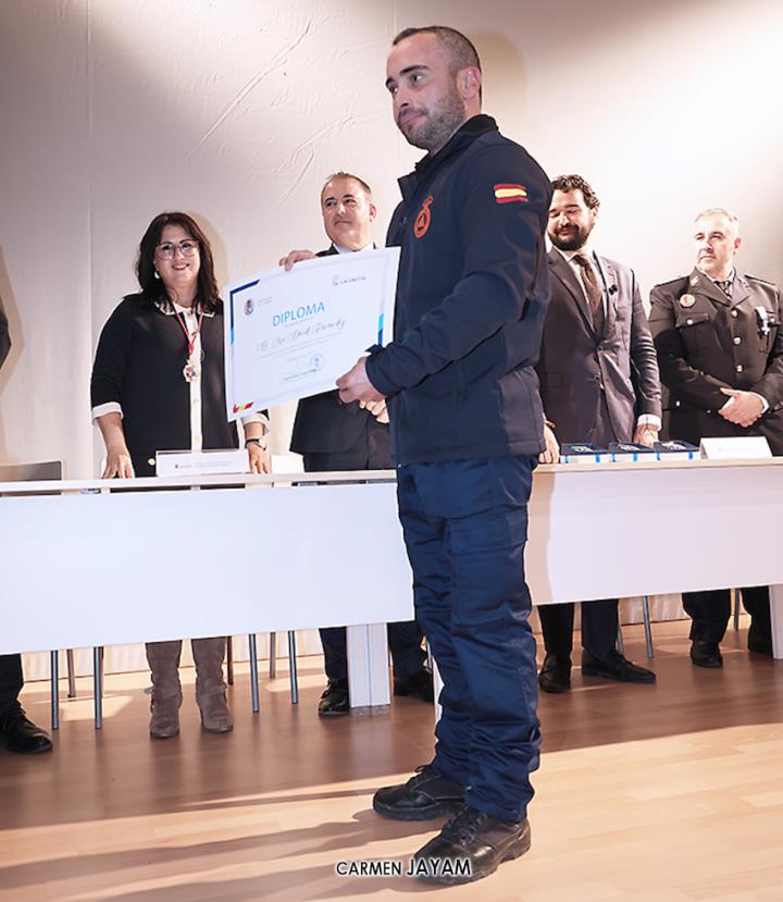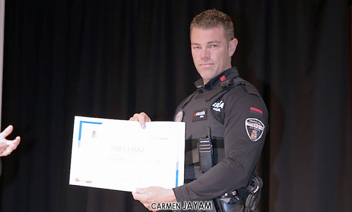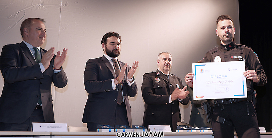 Después tuvo lugar el capítulo de entrega de reconocimientos, comenzando por los seis agentes que ha tenido una labor ejemplar, ejemplo de vocación de servicio, y cuyas distinciones fueron aprobadas por la junta del gobierno local: Juan López Quintera, Juan Luis Segado, Diego Segado, Alejandro Cuenca, Daniel Lorca y Gerardo Artés, a los que se sumó José David Fernández, voluntario de Protección Civil de La Unión, para quien fue una sorpresa escuchar su nombre, pues nadie le había avisado.