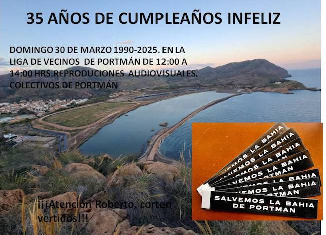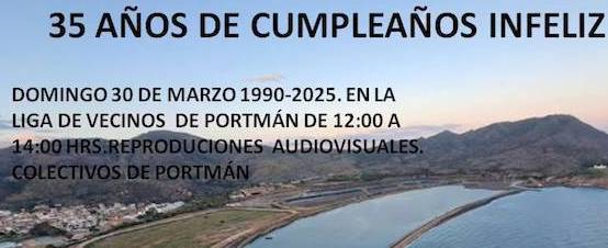 Además de la marcha anunciada por 'Portmán vivo', este domingo se ha organizado en la sede de la Liga de Vecinos dos horas (de 12 a 14) de reproducciones audiovisaules de los colectivos del pueblo relacionadas con lo acaecido aquel 30 de marzo de 1990 y en los 7 lustros siguientes de promesas incumplidas para regenerar la bahía.
