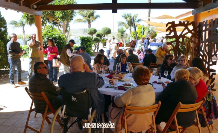 Fue un acierto la fórmula de organizar la convivencia si estar sujetos a posiciones fijas de mesa, pues así las conversaciones se alternaban entre unos y otros aderezadas por esos manjares gastronómicos, siendo las habas y los pésoles (guisantes) los que recibieron a los participantes junto a pan con sobrasada sabrosa, como también resultaron los productos que después iban llegando procedentes de una barbacoa que cuidó mucho que longanizas, lomos y pancetas estuvieran en su punto, a lo que sumaron las hervidas morcillas y una exquisita careta de cerdo. Ahí no terminaron las propuestas de ingesta alimentacia, pues aún faltaban los plato de habichuelas con cerdo y de arroz obtenido de las dos paelleras que se activaron en la jornada.
