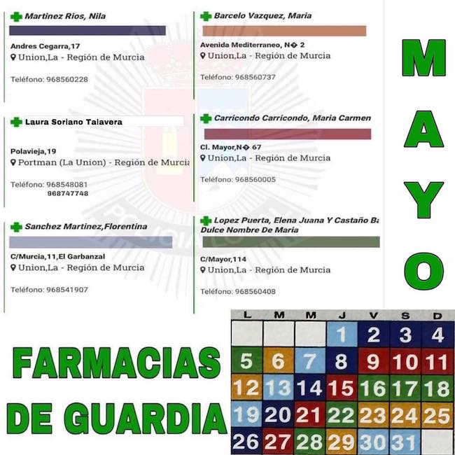 Aunque al principio publicábamos el cuadro de las farmacias de guardia de la ciudad de La Unión, hemos visto que es más completo y amplio el acceso al portal del Colegio Oficial de Farmacéuticos de la Región de Murcia, pues también incluye Portmán y Roche. Basta con ir a 'Buscar por municipio' seleccionar 'Unión (La)' y después, en 'Buscar por población', seleccionar La Unión (La), Portmán o Roche, apareciendo de inmediato las farmacias de cada localidad, indicando cual está de guardia y el horario de todas. De todas formas, en este artículo también publicamos el cuadro visual de la ciudad: