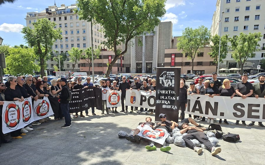 Más de doscientos vecinos de Portmán y La Unión se concentran ante el Ministerio para la Transición Ecológica para denunciar el abandono institucional y reclamar justicia ambiental.