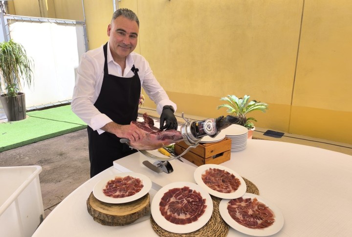 En el evento, celebrado en el Restaurante Finca Mayor , los asistentes fueron recibidos con un aperitivo consistente en jamón ibérico al corte acompañado con pan tostado y tomate, queso parmesano con almendras, brochetas de pollo con teriyaki y tornado de langostino .