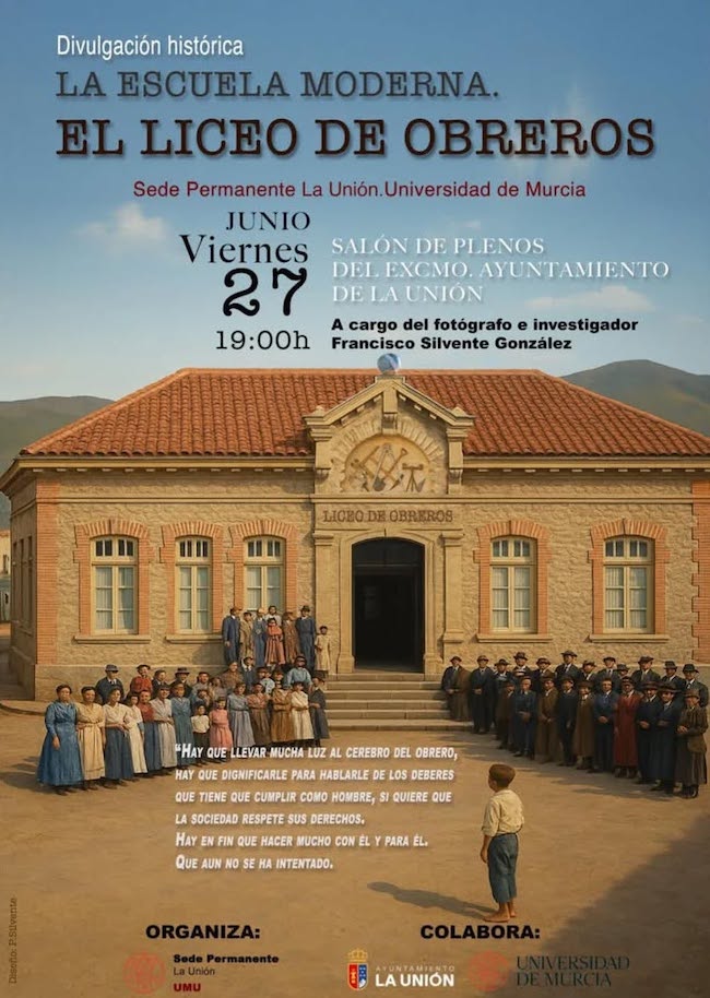 ¿Quieres saber los orígenes del edificio que alberga el nuevo Museo Minero de La Unión, y el inicio de su institución? 'La escuela moderna. El Liceo de Obreros' será la cita de divulgación histórica que tendrá lugar en el salón de actos del Ayuntamiento de La Unión el próximo viernes a partir de las 19 horas a cargo de Francisco Silvente, fotógrafo e investigador. El acto está organizado por la sede permanente de la Universidad de Murcia en La Unión y cuenta con la colaboración del Ayuntamiento de La Unión.