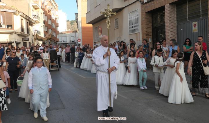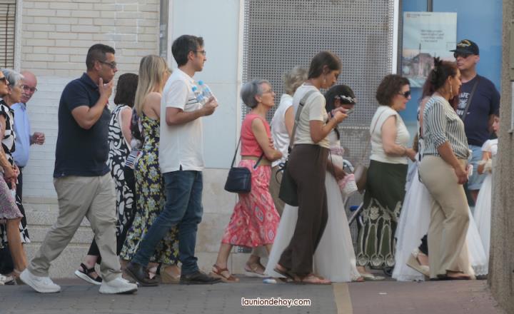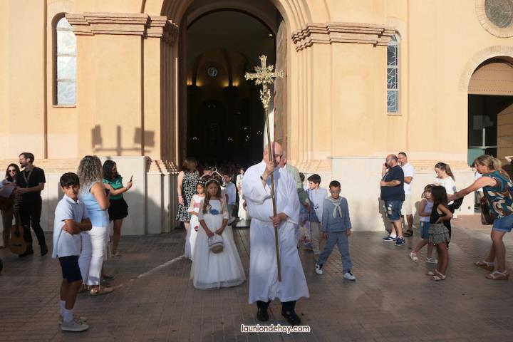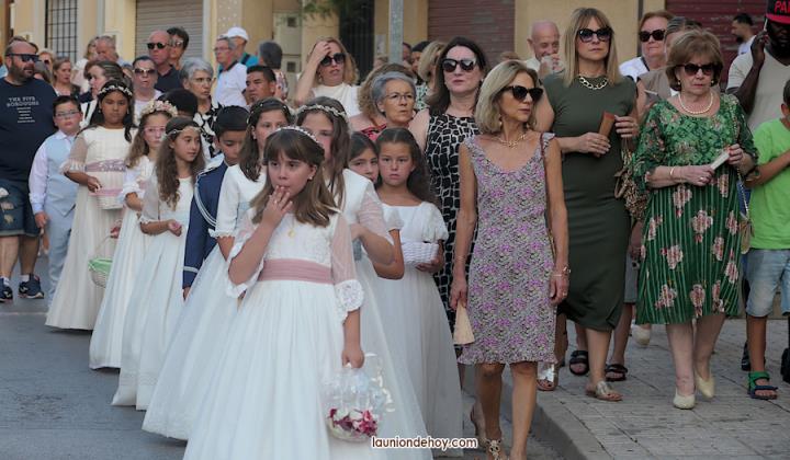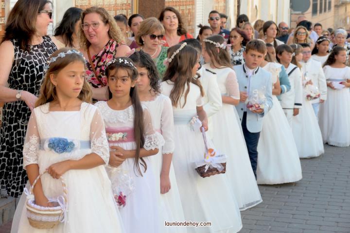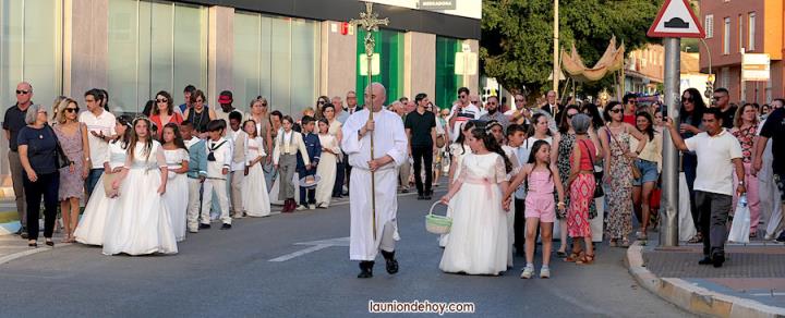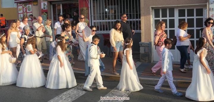 A las ocho menos cuarto se ha puesto en marcha la comida, con la cruz como estandarte y en dos filas los 28 niños (con mayoría femenina) que este año han tomado por vez primera la comunión, que lucían muy diferentes estilos de vestuarios, todos muy atractivos, siendo uno de los más singulares el de torero que ha lucido Agustín Solano, hijo del rejoneador del mismo nombre.