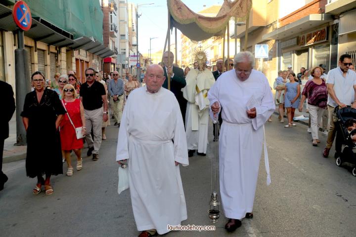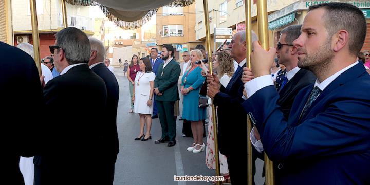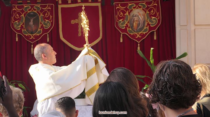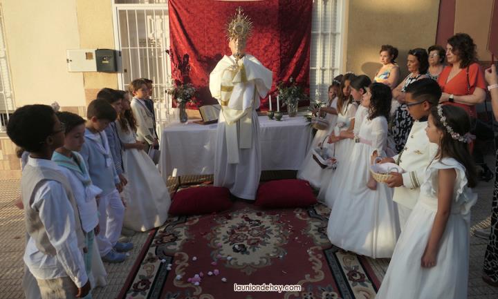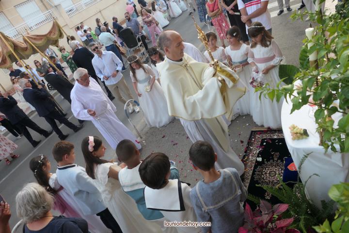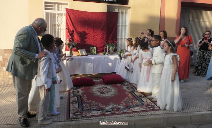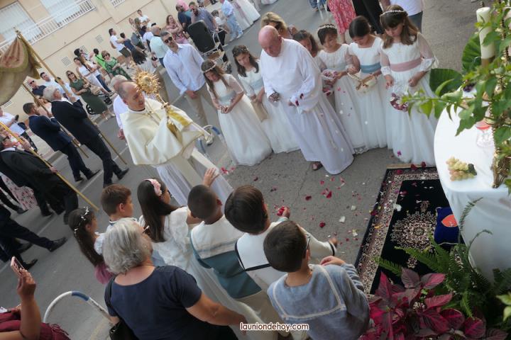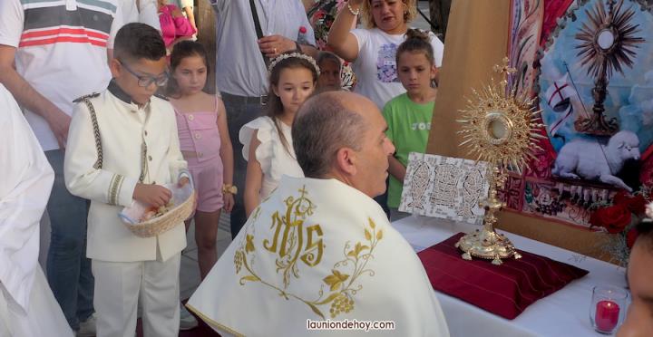 En cada uno de ellos, el reverendo Ginés Luis Vicente ha llevado 'la custodia', avanzando entre pétalos que lanzaban los niños de la primera comunión, para después pronunciar a través de la megafonía textos del libro de 'Las adoraciones al Señor'. Destacar que la música cantada ha acompañado la marcha, de cuyo buen desarrollo se han encargado efectivos de Policía Local y de Protección Civil.