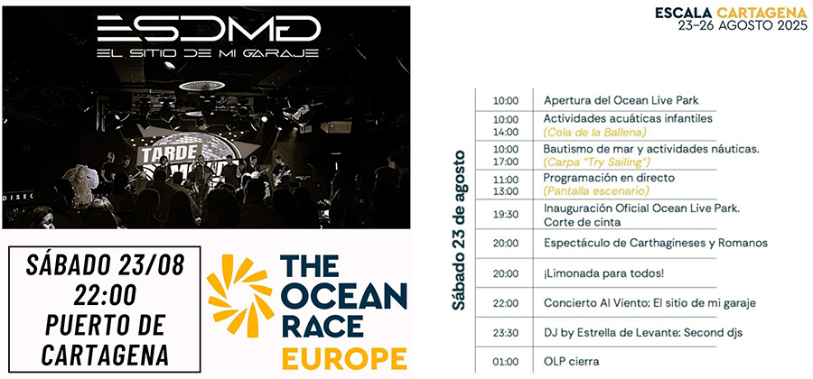 La banda unionense de 'El sitio de mi garaje', a la que se observa en la foto en el concierto de hace unas fechas en Cabo de Palos, actúa esta noche en las actividades organizadas (todas gratuitas) en el puerto de Cartagena con motivo de la llegada de la regata internacional 'The Ocean Race Europe'.