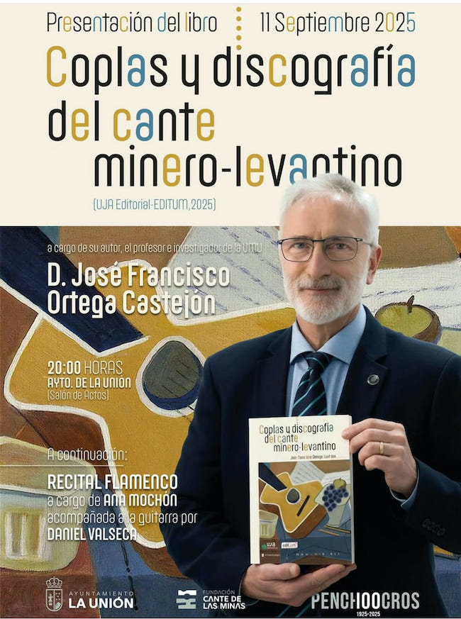 1. 'Copas y discografía del cante minero-levantino' es el título del libro escrito por José Francisco Ortega Castejón, profesor e investigador de la Universidad de Murcia, que se será presentado en la sede del Ayuntamiento de La Unión el jueves de la semana próxima en un acto con acceso gratuito para el público que culminará con un recital flamenco a cargo de Ana Mochón, con Daniel Valseca a la guitarra.