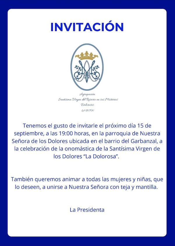 3. Las misas en honor a la Virgen de los Dolores se celebrará el domingo 14 de este mes en Roche y al día siguiente en El Garbanzal