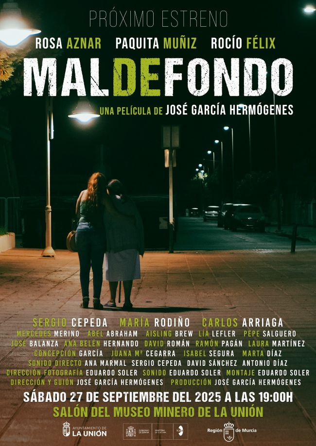 La película 'Mal de fondo', dirigida por el unionense José García Hermógenes, tendrá su puesta de largo el sábado 27 de septiembre, a las siete de la tarde, en el salón de actos del Museo Minero. Las entradas ya están a la venta. Está protagonizada por Rosa María Aznar, Paquita Muñiz, Rocío Félix y Sergio Cepeda.
