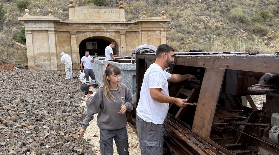 El alcalde de La Unión, Joaquín Zapata, ha visitado el entorno minero del Túnel “José Maestre”, en Portmán, para conocer de primera mano los trabajos de conservación y pintura realizados por el alumnado del Programa Experiencial “La Unión avanza en formación y empleo joven”.Esta actuación forma parte del itinerario de construcción del programa y tiene como objetivo la preservación y puesta en valor del patrimonio minero. Los jóvenes participantes han desarrollado tareas de pintura, restauración y protección contra la oxidación en locomotoras, vagonetas y maquinaria histórica situadas en el acceso al túnel y su entorno.