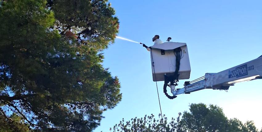 El Ayuntamiento de La Unión inició ayer, en los centros docentes Santiago Apóstol y Enrique Viviente, las labores de fumigación contra la procesionaria del pino que puede causar conjuntivitis si entra en contacto con los ojos y que provoca problemas respiratorios si se inhala, además de irritación en la piel si se entra en contacto.