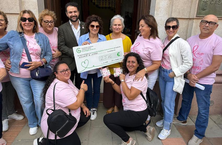 La Asociación de Mujeres de La Unión, durante la celebración esta mañana de la lectura del manifiesta con motivo del ‘Día mundial contra el cáncer de mama’, ha entregado el dinero que ha recaudado para ayudar a la labor que lleva a cabo la AECC en el municipio y a la investigación de esta enfermedad.
