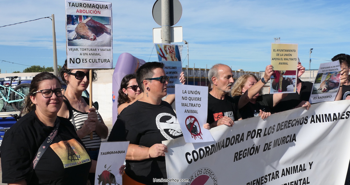 Un grupo de personas se han concentrado en la explanada del polideportivo municipal de La Unión en la media hora previa al inicio del festival de toros que se ha celebrado a unos doscientos metros.