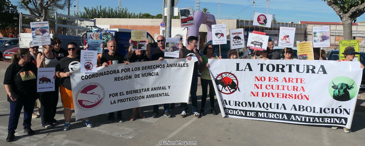 Los participantes que ha acudido a la convocatoria efectuada por la 'Coordinadora por los derechos animales de la Región de Murcia' ha mostrado diversas pancartas relacionadas con su protesta contra la tauromaquia, como se observa en la fotografía tomada a las 16.22 horas de este sábado.