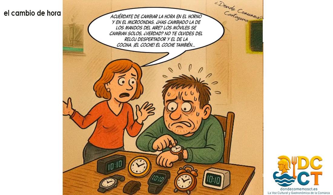 El cambio al horario de invierno lleva a Enrique Costa y Aida Belmonte, del portal '¿Dónde comemos?, Cartagena', a ofrecer una simpática viñeta a los lectores.