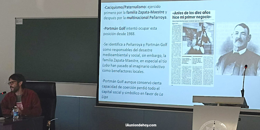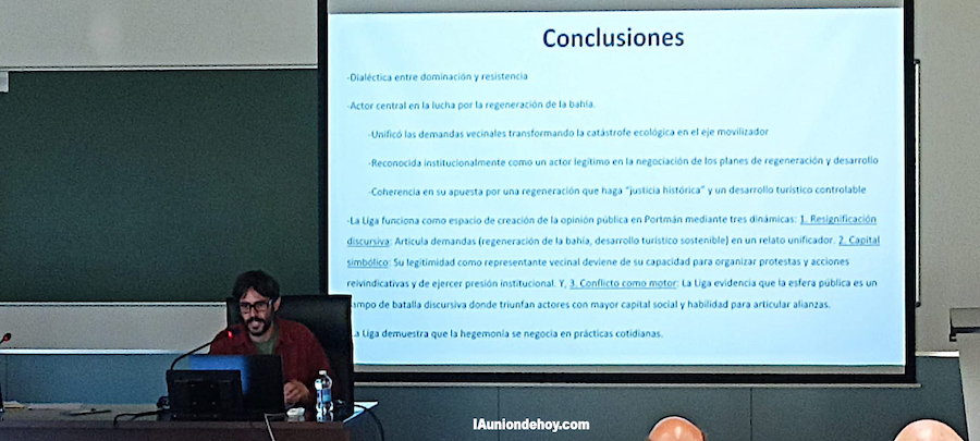 La quinta edición del 'Congreso nacional etnográfico del Campo de Cartagena' se ha desarrollado, bajo el lema de 'Los espacios de sociabilidad: pasado, presente y futuro', en el salón de grados del edificio de la Facultad de Ciencias de la Empresa de la UPCT, en Cartagena, habiendo ofrecido dos ponencias relacionadas con La Unión. Una fue 'La cocina económica de La Unión', que ofreció Gonzalo Wandosell Fernández de Bobadilla, cronista oficial de La Unión, y de la que informamos hace unas fechas. La otra tuvo lugar en la jornada de clausura con el tema 'La Liga de Vecinos de Vecinos de Portmán (La Unión) como espacio de creación de opinión pública', una ponencia elaborada por Pedro López Egea y Raúl Travé Molero, siendo este último el que la expuso.