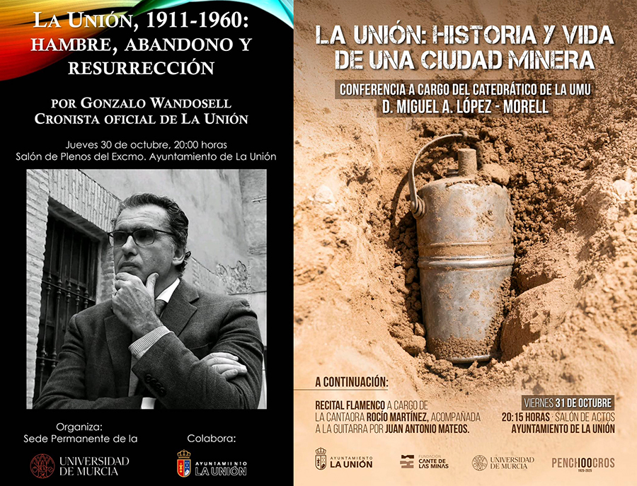 El salón de actos del ayuntamiento de la capital de la Sierra Minera acoge este jueves la conferencia 'La Unión 1911-1960: hambre, abandono y resurrección' a cargo del cronista oficial del municipio, Gonzalo Wandosell, y el viernes será el marco de 'La Unión:historia y vida de una ciudad minera', que ofrecerá Miguel A. López-Morell, catedrático de la Universidad de Murcia, la cual culminará con un recital flamenco. El acceso a ambas es gratuito.