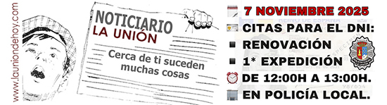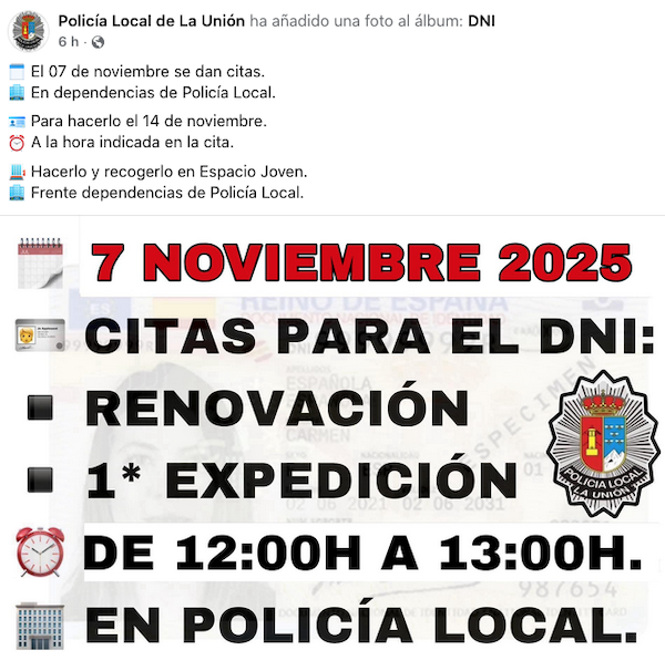 Policía Local de La Unión informa a los vecinos que el próximo viernes, en su cuartel de la plaza de García Mateos, se darán citas para la primera expedición o renovación del documento nacional de identidad, siendo el 14 de noviembre la fecha para hacerlas.