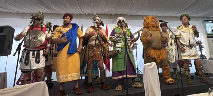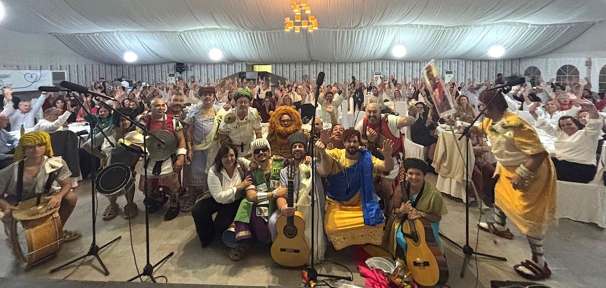 La comida benéfica organizada por la junta local de La Unión reunió a doscientas personas en un ameno y solidario encuentro, en el que también se volcó el comercio con sus donaciones y que incluyó el humor de la chirigota 'Los robinsones de La Isla', a los que se observa en la foto superior.