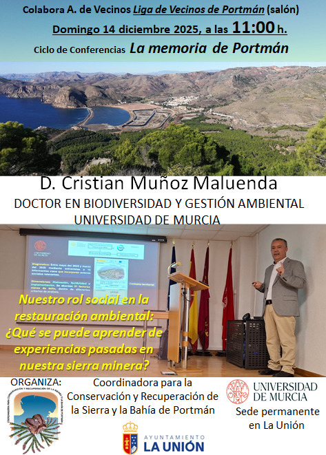 Cristian Muñoz Maluenda, doctor en Biodiversidad y Gestión Ambiental de la Universidad de Murcia, protagoniza la siguiente cita del ciclo de conferencias 'La memoria de Portmán', que tendrá lugar en la Liga de Vecinos el próximo domingo. El título de la charla es 'Nuestro rol social en la restauración ambiental: ¿Qué se puede aprender de experiencias pasadas en nuestra sierra minera?