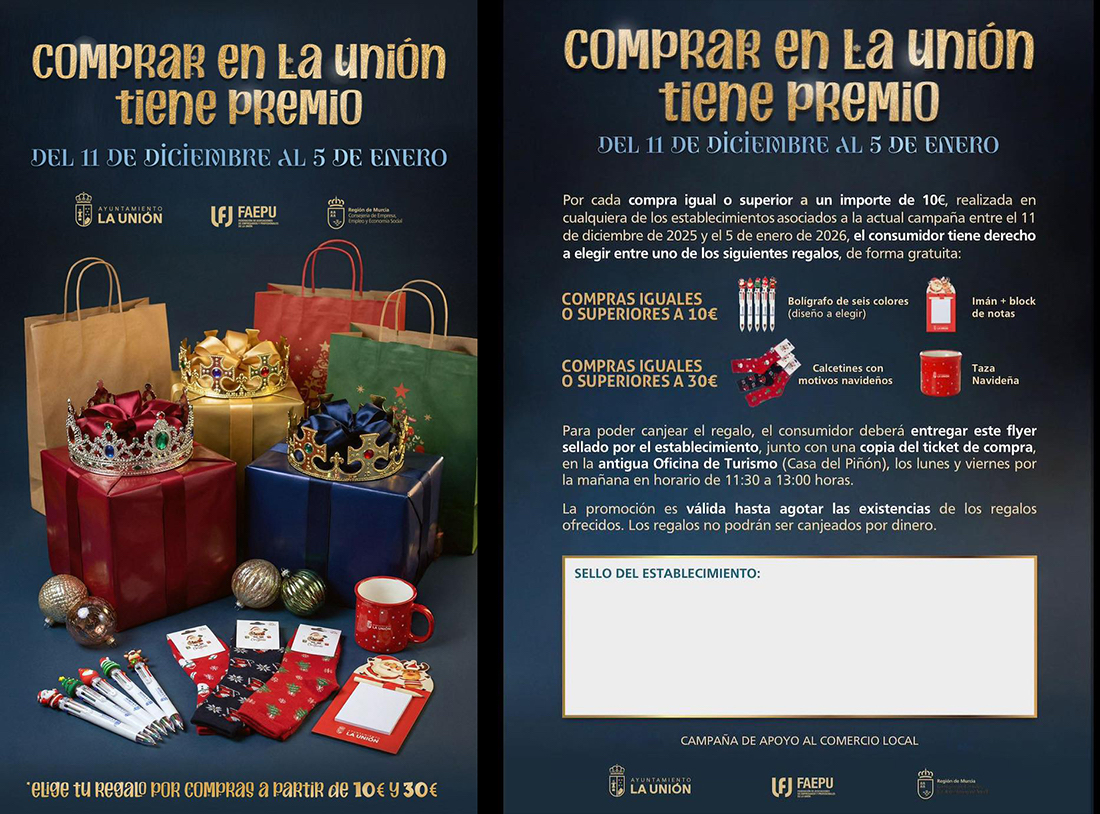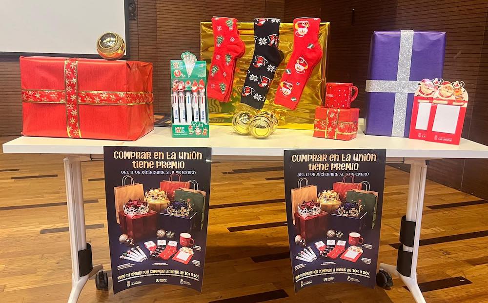 La nueva campaña lanzada por el ayuntamiento para potenciar las compras en La Unión, que ya ha arrancado y durará hasta el 5 de enero, permite canjear por regalos compras desde 10 euros.