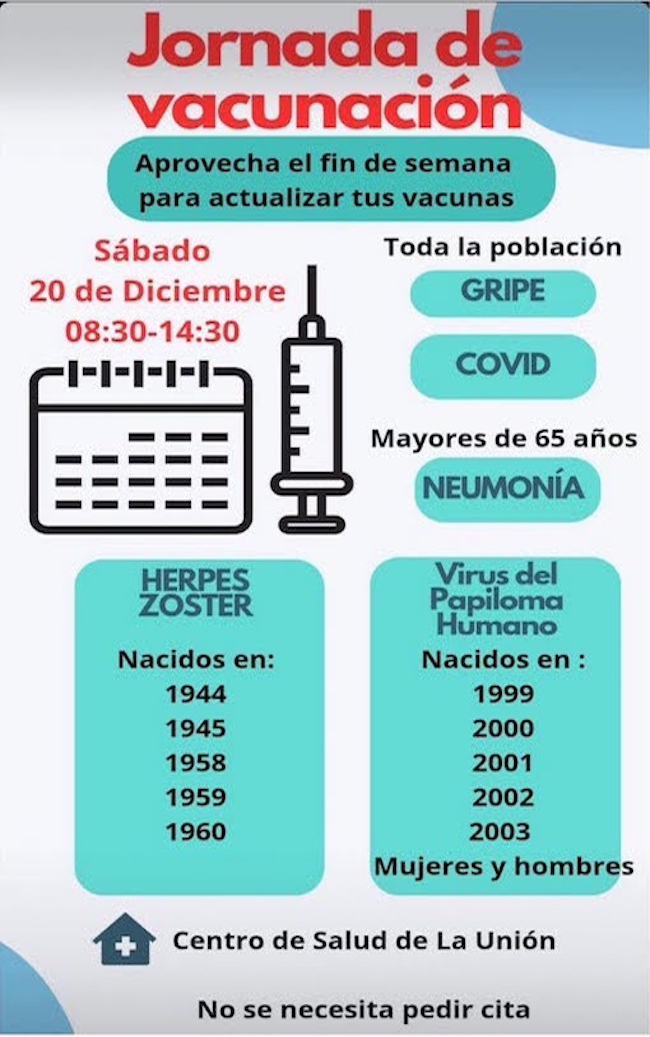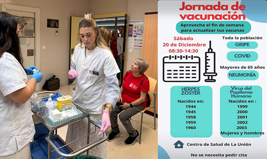 La Consejería de Salud informa que, según los datos epidemiológicos de la Red Centinela sanitaria regional, en la semana del 8 al 14 de diciembre ha aumentado la incidencia de consultas por infecciones respiratorias agudas en Atención Primaria un 5,6% respecto a la anterior, con 1.040 casos por 100.000 habitantes. En la gripe, el aumento es del 62%, con 4.707 casos registrados y una tasa acumulada de 295 casos por cada 100.000 habitantes, frente a los 182 de días atrás. La bronquitis y bronquiolitis aguda sube el 5,4% y el covid asciende un 12,5%. Este sábado hay convocatoria de vacunación sin cita en el centro de salud de La Unión.