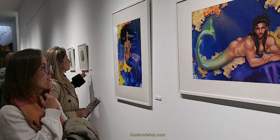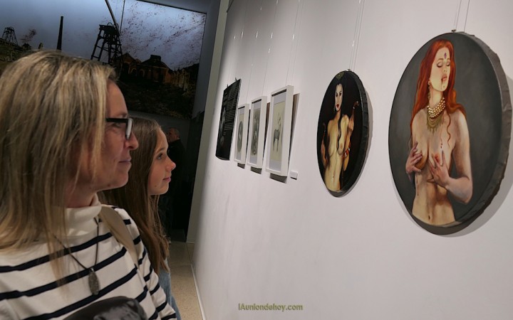 El unionense desveló que hay obras definitivas, como los dios Pan y Baco en novedosos lienzos circulares, y otras en las que ha aplicado la pintura digital, además de ofrecer bocetos por culminar elaborados en grafito. También explicó la estructura de la distribución por las tres paredes que rodean al malacate en la sala de exposiciones del Museo Minero.
