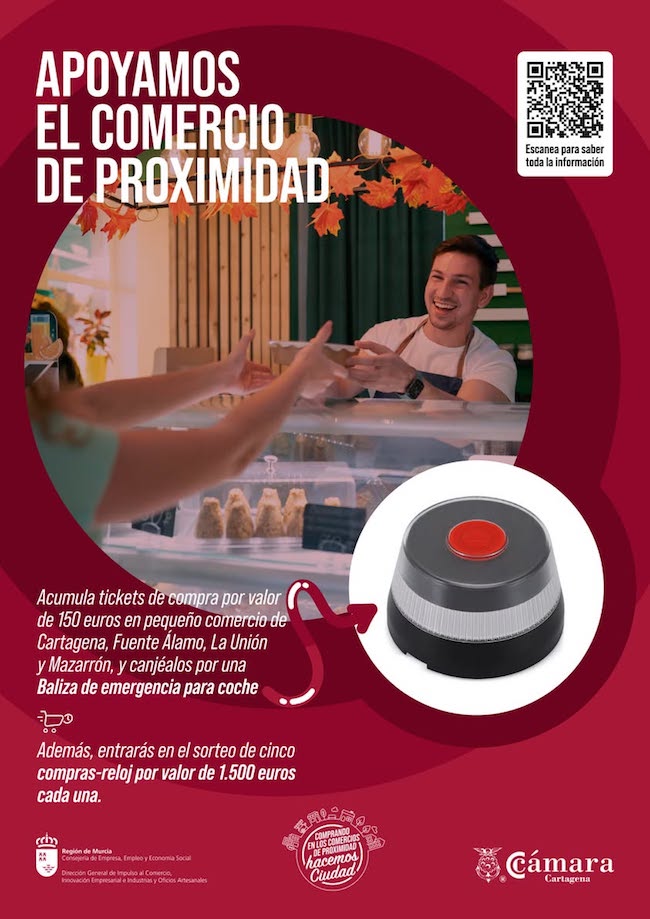 La consejería de Comercio y la Cámara de Comercio presentan una nueva campaña para dinamizar el comercio de proximidad de Cartagena, La Unión, Fuente Álamo y Mazarrón. Acumulando tiques de compra de 150 euros se tendrá una baliza de emergencias para coche de regalo y habrá un sorteo para optar a cinco cheques de 1.500 euros para gastar en varios establecimientos en 150 minutos.