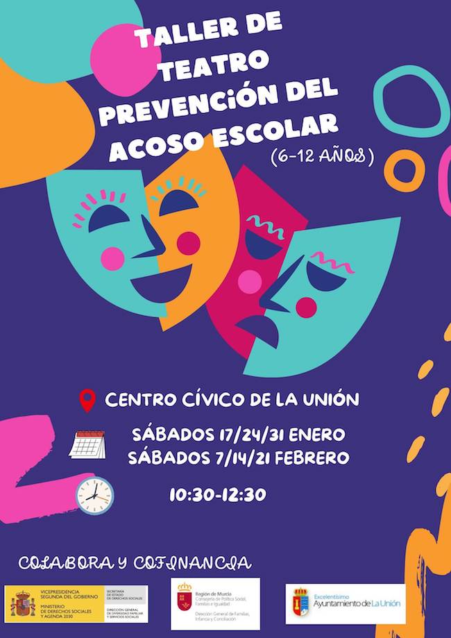 3. Servicios Sociales de La Unión anuncia para los sábados de enero y febrero la celebración de un taller de teatro orientado a la prevención de la ‘intimidación (bullying) escolar’, en el que los chavales aprenderán a expresarse, trabajar en equipo y reflexionar sobre el respeto y la convivencia a través del juego teatral. El teatro se utilizará como herramienta educativa para identificar, prevenir y actuar frente al acoso escolar, siempre desde una metodología lúdica y adaptada a la edad. Dirigidos a niños de 6 a 12 años. Plazo de inscripción: 12 de enero de 2026 en el centro cívico de La Unión.
