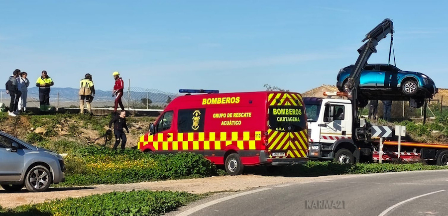 El grupo de rescate acuático de bomberos de Cartagena ha acudido hoy a una balsa situada cerca de la ermita de Roche, junto al polígono industrial de Los Camachos, para sacar del agua un turismo que tuvo un accidente, derribando el vallado de seguridad de esta instalación.