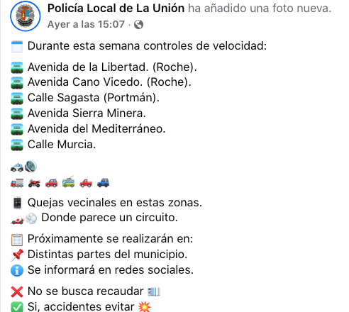 1. La Policía Local informa que el radar estará ubicado en las avenidas de la Libertad y de Cano Vicedo, en Roche; en la calle Sagasta, de Portmán; y en las avenidas Sierra Minera y Mediterráneo de la ciudad, además de la calle Murcia.